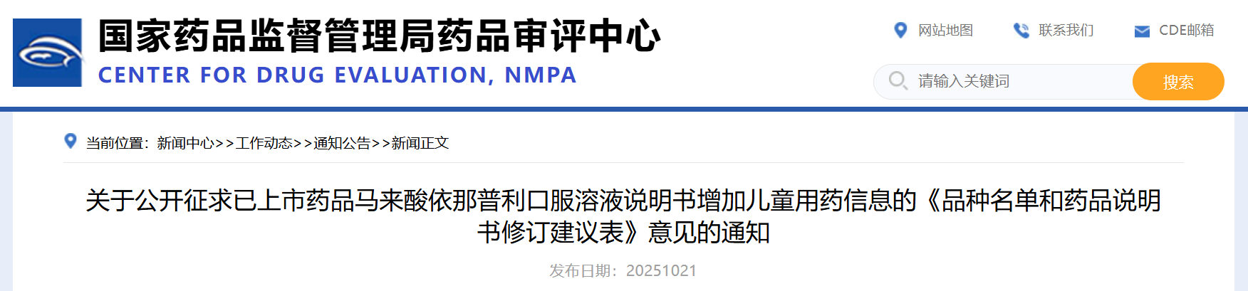 关于公开征求已上市药品马来酸依那普利口服溶液说明书增加儿童用药信息的《品种名单和药品说明书修订建议表》意见的通知