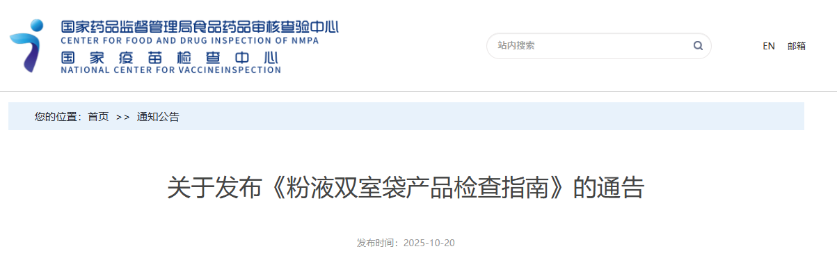 关于发布《粉液双室袋产品检查指南》的通告