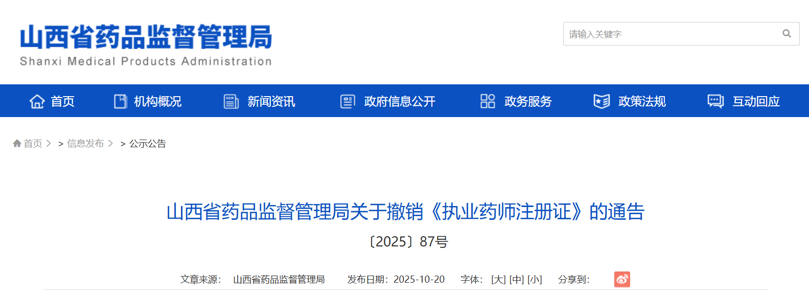 山西省药品监督管理局关于撤销《执业药师注册证》的通告
